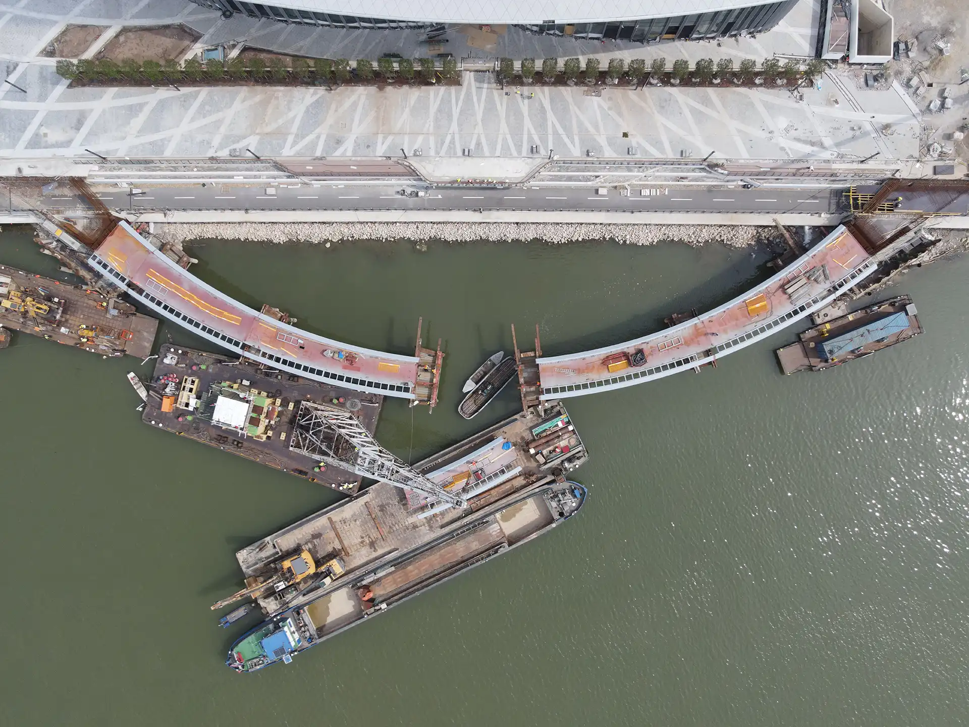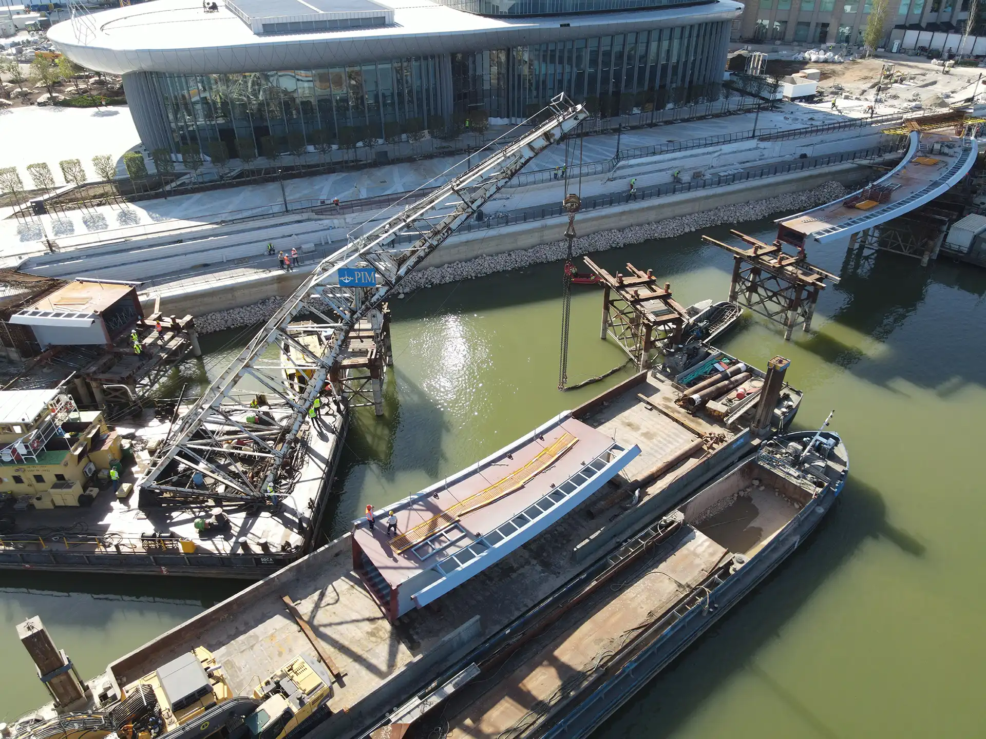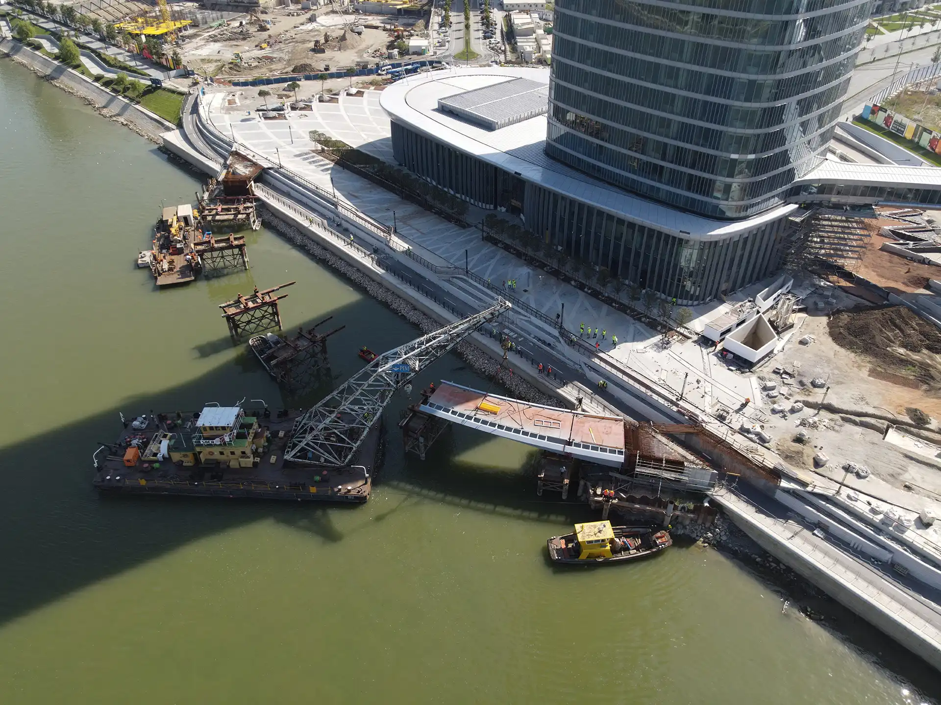 Širina pešačke staze je promenljiva, od 4,0 m u sredini do više od 10 m na kontaktu sa šetalištem. Konstruktivna visina sanduka je takođe promenljiva, od 1,5 m u sredini raspona do 3,25 m na mestu uklještenja u betonski „kljun“. Veza čeličnog, sandučastog preseka rasponske konstrukcije i betonskog sandučastog preseka ostvaruje se navojnim ankernim šipkama prečnika 40 mm.